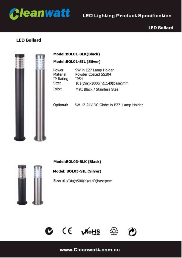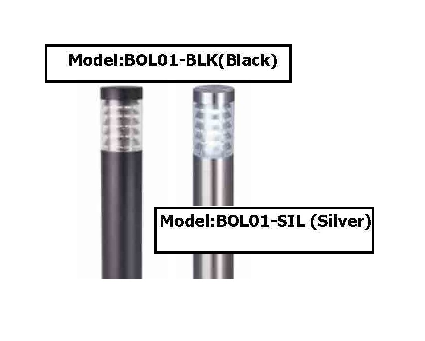 LED Bollard: Model BOL01-BLK in Matt Black / BOL01-SIL in Stainless Steel